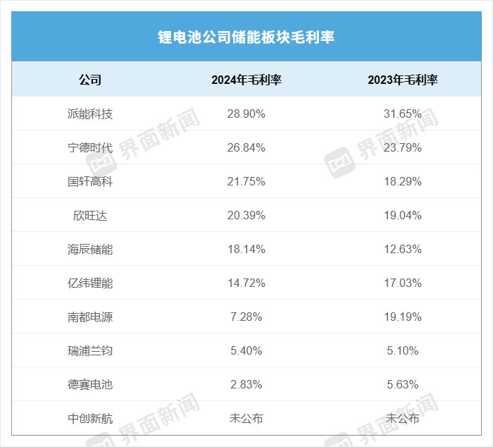 在界面新闻统计的锂电池公司中,德赛电池(000049.SZ)去年储能业务毛利率垫底。
