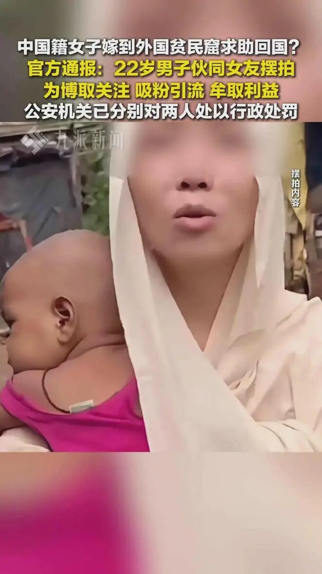 近期,有网民在网上发布有关“中国籍女子嫁到外国贫民窟求助回国”的视频,引发大量网民关注、讨论。经查靠谱配,杨某江(男,22岁)伙同其女友陈某心(女,25岁)为博取关注、吸粉引流,以直播带货、牟取利益,共同策划、拍摄了以上虚假视频并发布在短视频平台,误导公众产生错误认识,扰乱公共秩序。目前,公安机关依法对杨某江、陈某心分别处以行政处罚。