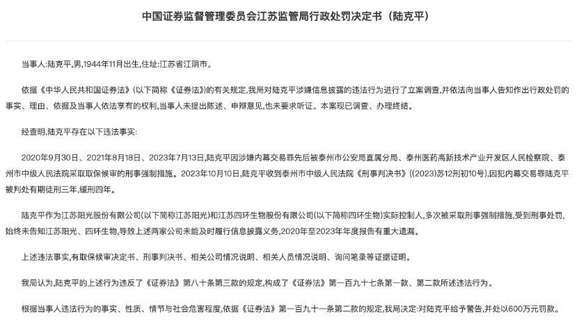 江苏证监局认为,陆克平作为江苏阳光和四环生物的实际控制人,多次被采取刑事强制措施,受到刑事处罚,始终未告知江苏阳光、四环生物,导致上述两家公司未能及时履行信息披露义务,2020年至2023年年度报告有重大遗漏。基于此,陆克平被给予警告,并处以600万元罚款。