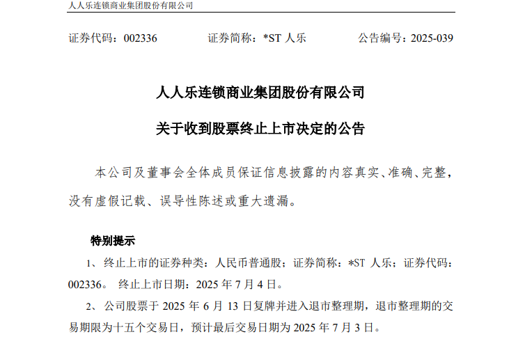2024年4月22日,因公司2023年度经审计的净资产为-3.87亿元,*ST人乐股票交易被实施退市风险警示。2025年4月30日,*ST人乐在股票交易被实施退市风险警示后披露的首个年度报告显示,公司2024年度经审计的期末净资产为-4.04亿元,财务会计报告被出具无法表示意见的审计报告,财务报告内部控制被出具否定意见的审计报告,触及股票终止上市情形。根据深交所相关规定以及上市审核委员会的审议意见,深交所决定*ST人乐股票终止上市。