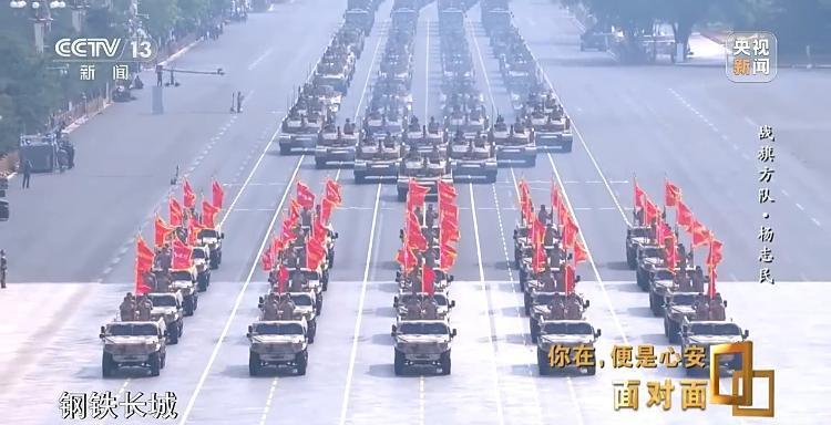 杨志民:80面战旗在最前列,迎风招展,通过长安街驶过天安门,身后是滚滚的铁流、钢铁长城,像一条长龙一样在战旗的身后。这样一种恢宏的画面感,呈现在镜头面前的时候,呈现在世人、国人面前的时候,是非常有视觉冲击力的。